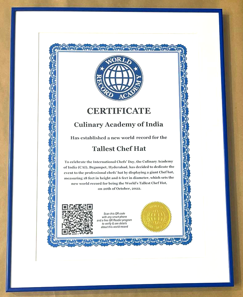 Hyderabad, Telangana, India--To commemorate the International Chefs’ Day, the Culinary Academy of India (CAI), Begumpet, Hyderabad, Telangana, India, has decided to dedicate the event to the professional chefs’ hat by displaying a giant Chef hat, measuring 18 feet in height and 6 ft in diameter, which sets the new world record for being the World's Tallest Chef Hat, according to the WORLD RECORD ACADEMY.