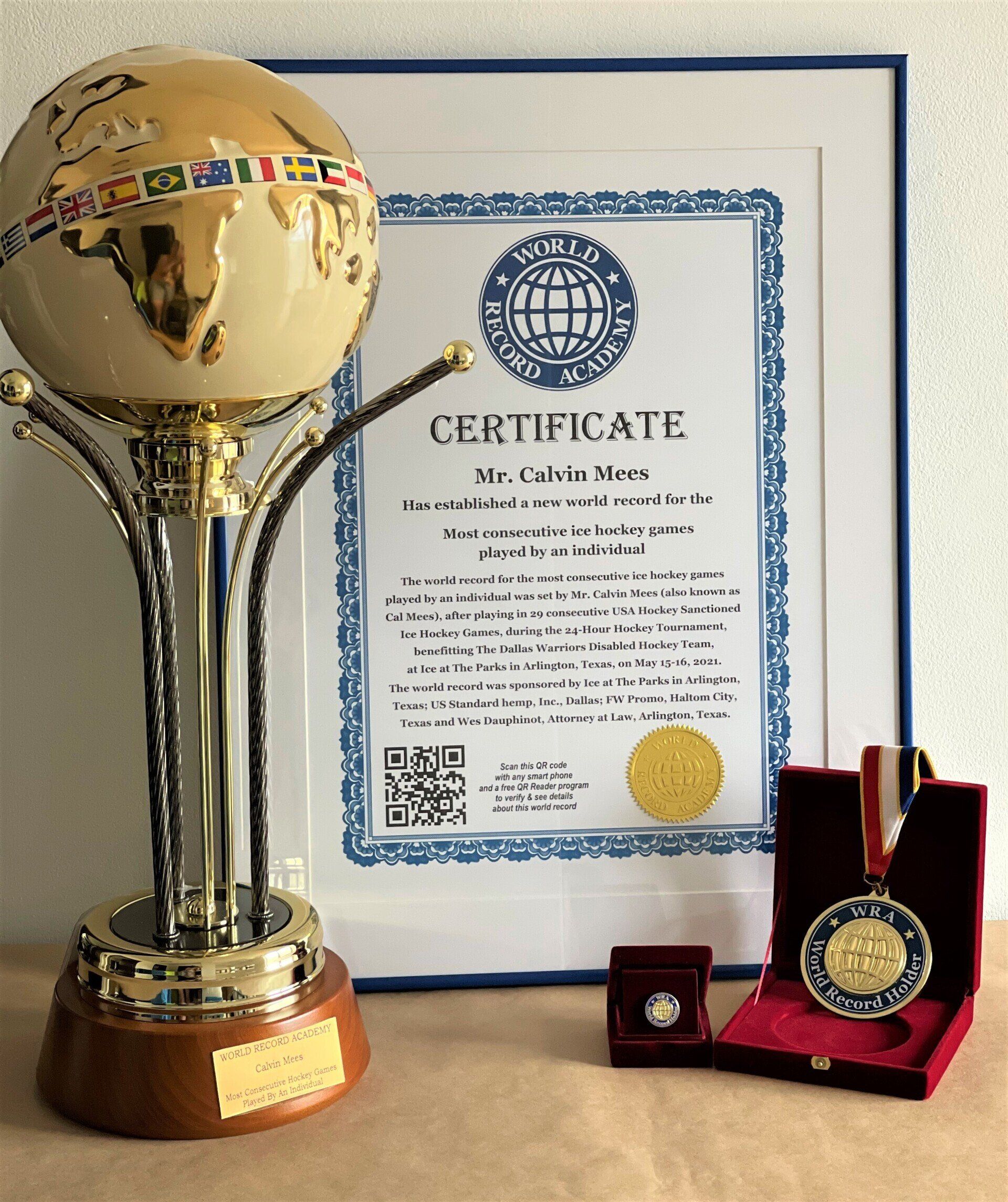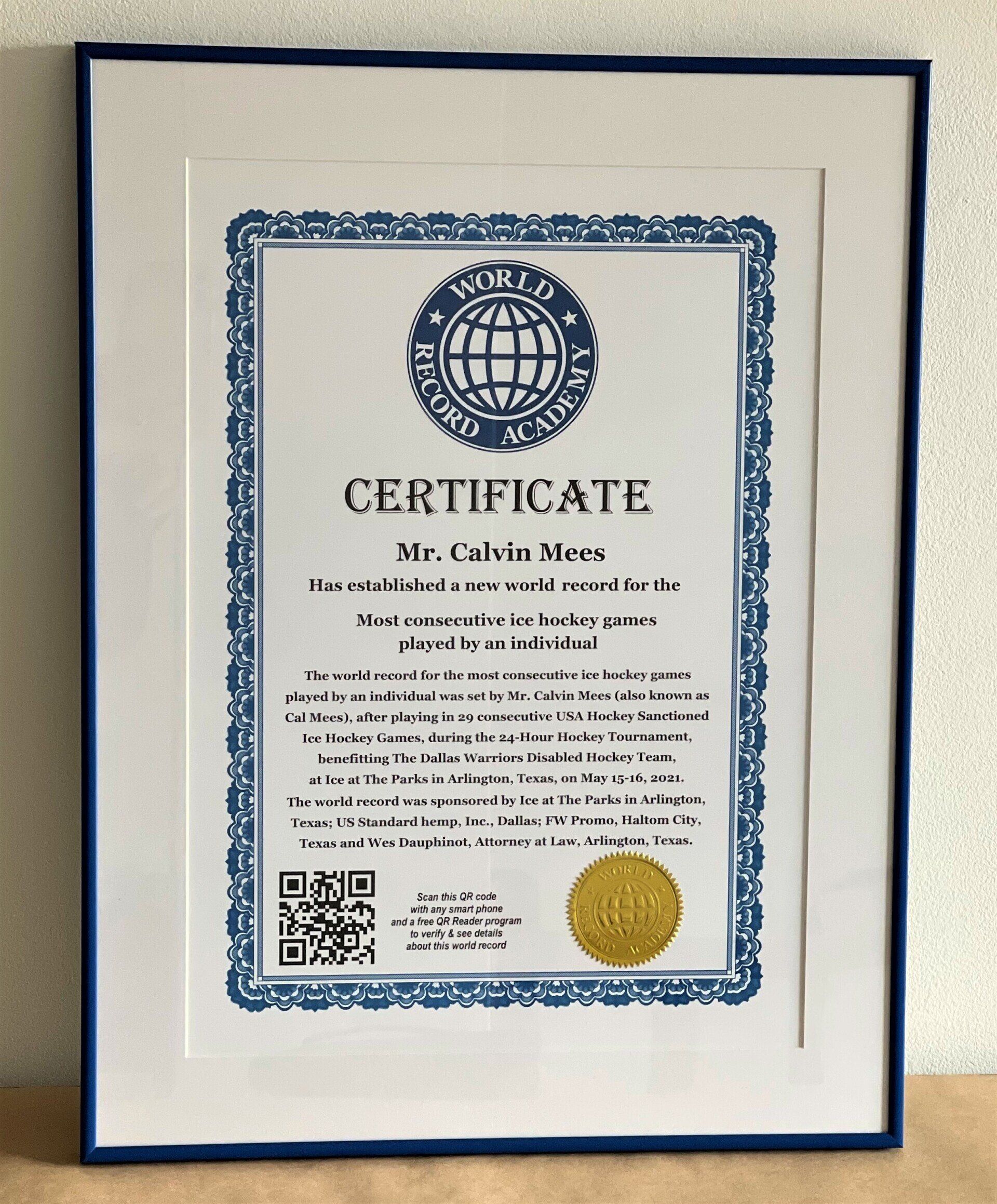 "There was never any doubt as to Cal’s dedication or ability to accomplish this massive goal, to set a World Record . Cal a disabled veteran himself works tirelessly to create awareness for his Dallas Warriors disabled veteran’s hockey team and he believed this would be a great way to create awareness that even the biggest goals can be achieved with hard work and dedication.